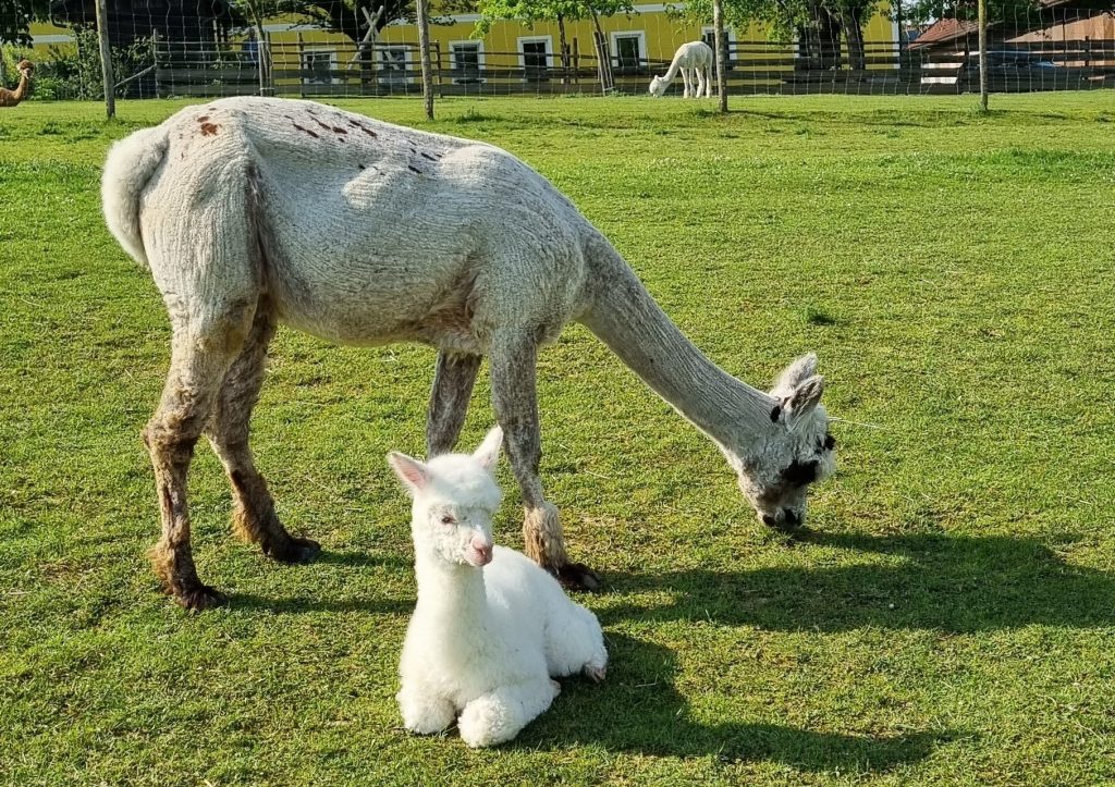 Das erste männliche Cria heuer namens Alois wurde am 20. Mai von unserer Stute Lucy geboren. Am Bild genießt Alois die warmen Sonnenstrahlen mit seiner Mama.